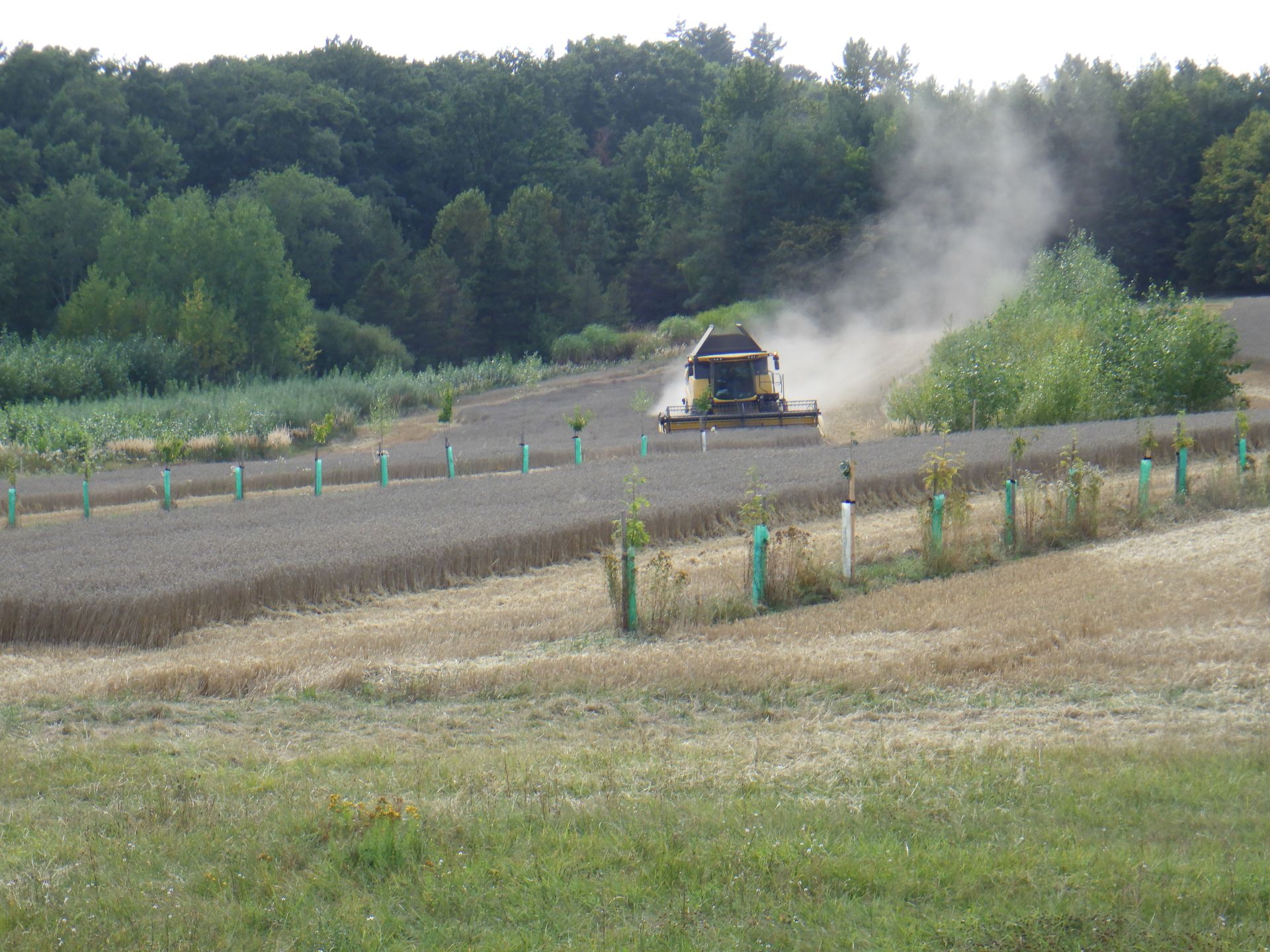 Tentokrát byla sklizena ozimá pšenice odrůdy Fakír ve třech výsadbách: ALS 1 (pokus se vzrostlými dřevinami), ALS 2 (protierozní pokus) a ALS 3 (nová výsadba dle dotačních podmínek nařízení vlády č. 140/2023 Sb.). Ze sklizně byly odebrány vzorky pro vyhodnocení výnosu a kvalitativních parametrů v laboratoři Zemědělského výzkumného ústavu Kroměříž. Letošní sklizeň se vydařila, předběžný odhad průměrného výnosu se podle Ing. Libora Stárka, který ji zajišťoval, pohybuje kolem 6–7 t/ha.