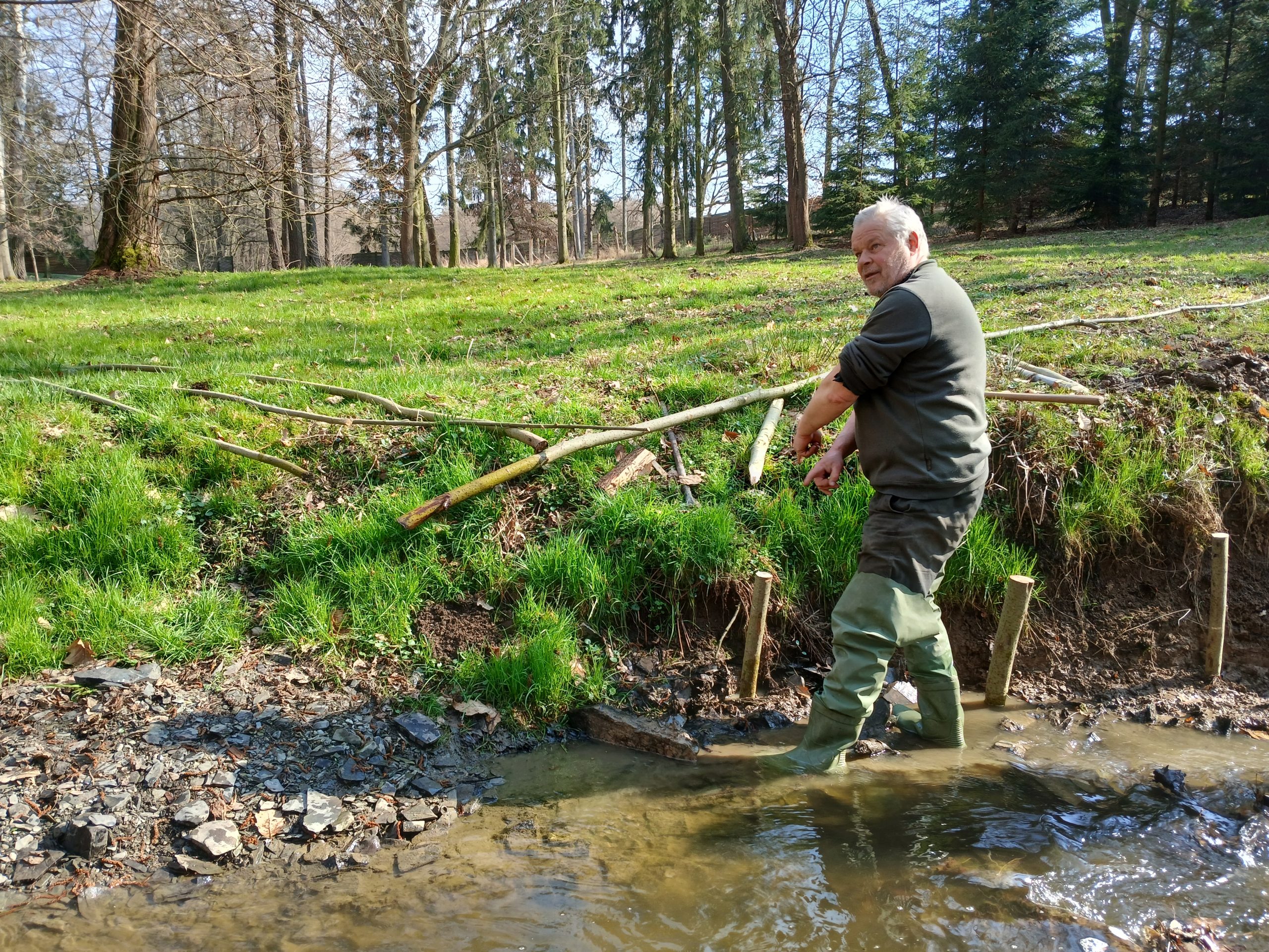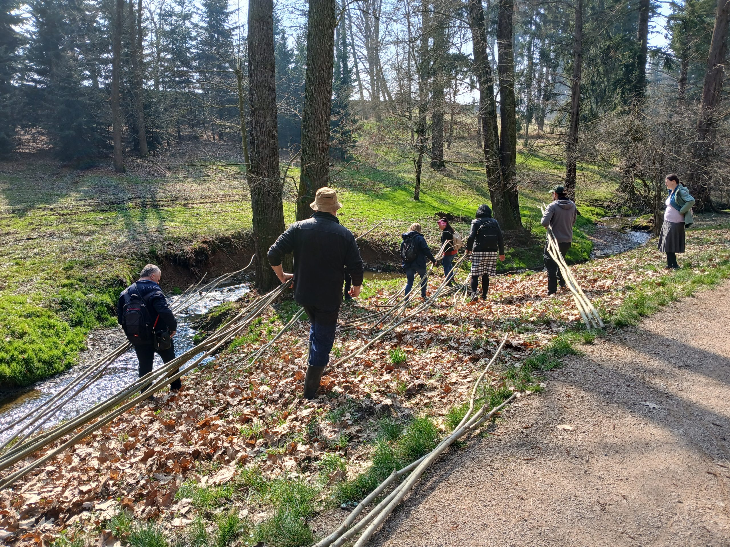 Odpoledne proběhla prohlídka pokusných porostů matečnic VÚK na Michovkách v Průhonicích a následně praktická ukázka výstavby haťového plotu v meandru Dobřejovického potoka v Průhonickém parku. Zde zástupci řešitelského týmu realizovali haťování části toku již v loňském roce s velmi dobrým výsledkem, neboť tudy proběhly tři povodňové vlny bez poškození břehů i hatí. Do ukázky se aktivně zapojili také zaměstnanci VÚK J. Weger a M. Kurdíková, kteří ze břehu i z vody asistovali jak při manipulaci s vrbovými pruty, tak i se samotným vyplétáním na osnovu či následným zahrnováním jedné strany hatě zeminou.